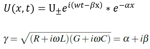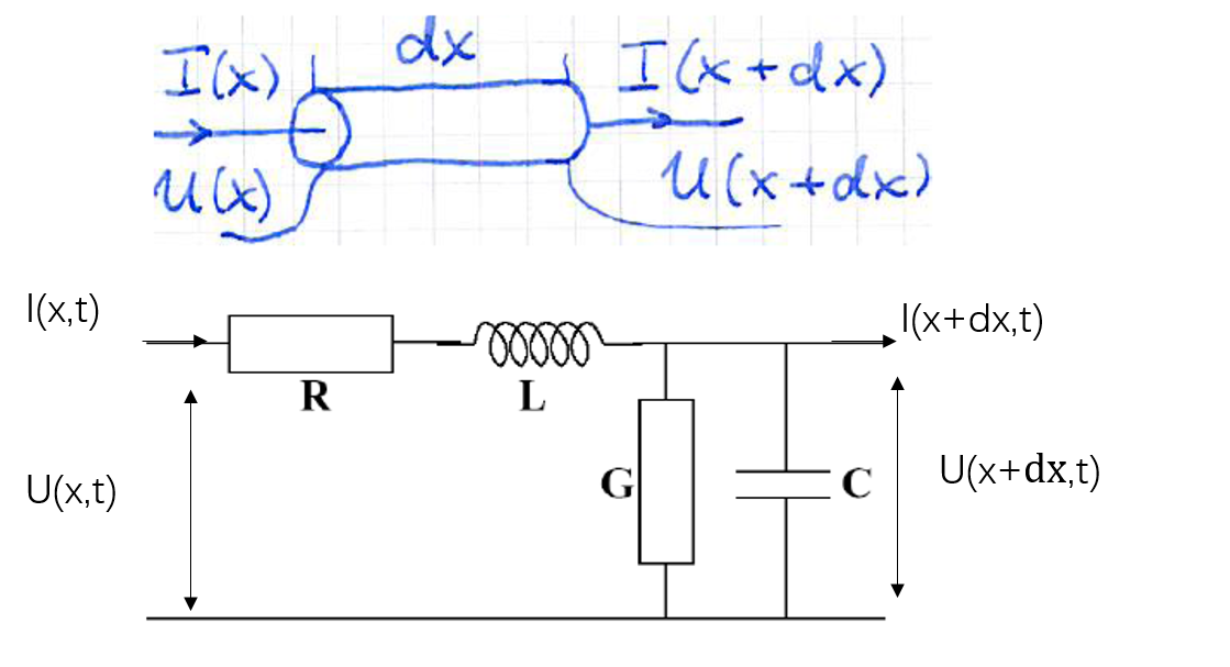分析一小段电缆,设电缆每单位长度包含电阻 R [Ohm/m],电感 L [H/m],漏电 G [S/m] 和电容 C [F/m]。信号电压的频率 f=2piw。