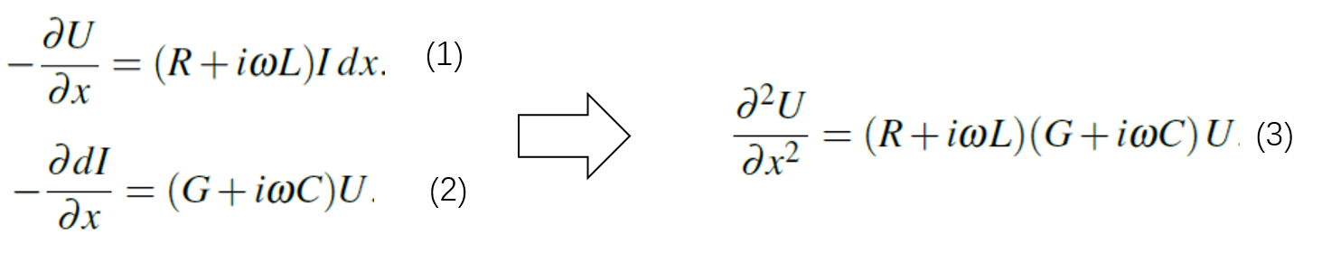 则这段小电缆中电压电流关系推出等式(1)和(2),将式子(1)两边对 x 偏微分代入式子(2)推出(3):